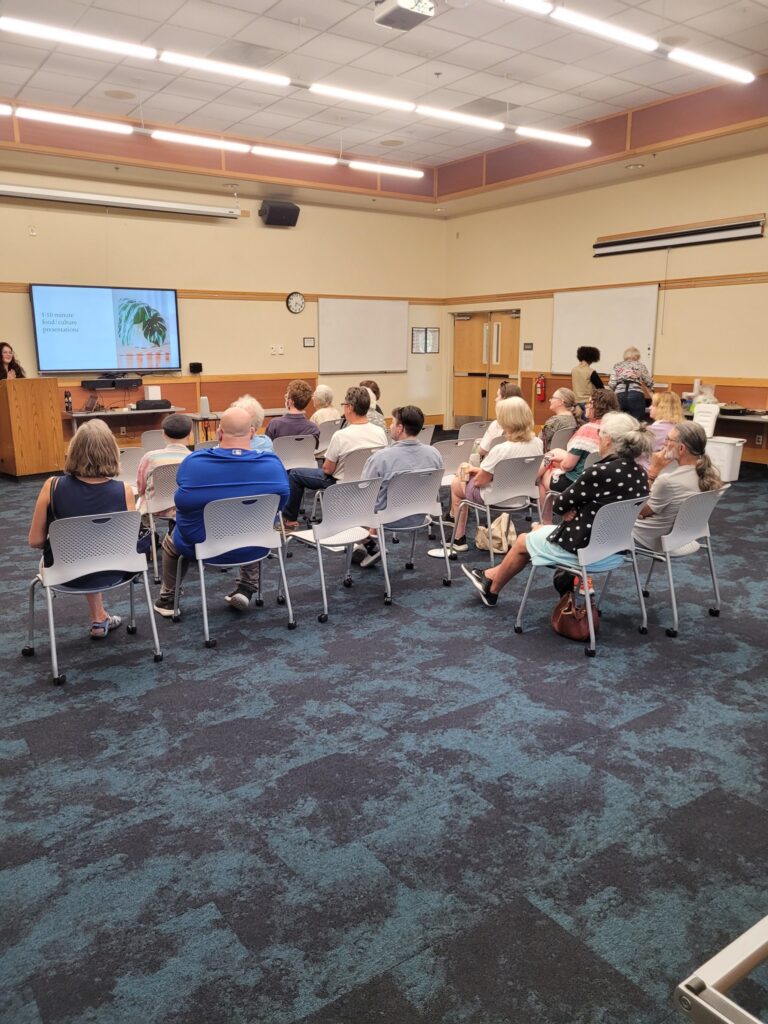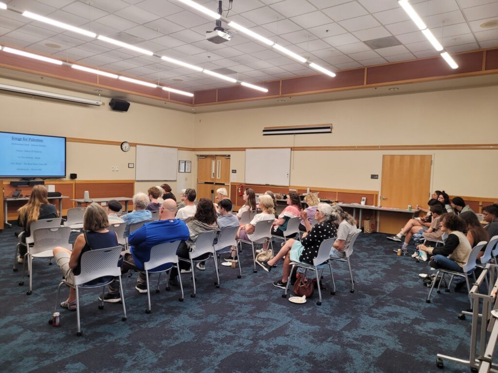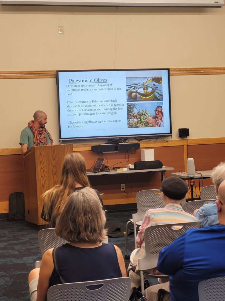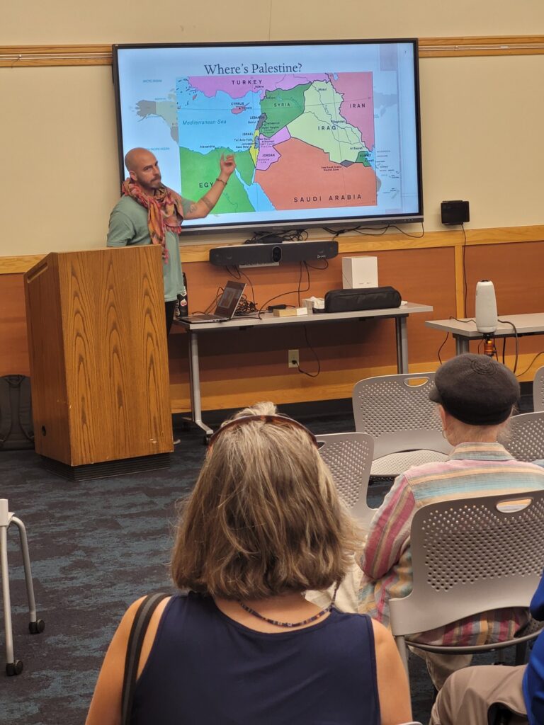 A crowd of around 35 people attended the (8/28/25) CRDC presentation: “Can We Talk About Palestine?” Thank you Julian Gomez for the presentation! Thank you to everyone that attended and participated in the lively discussions, and to those who provided the delicious Palestinian food.