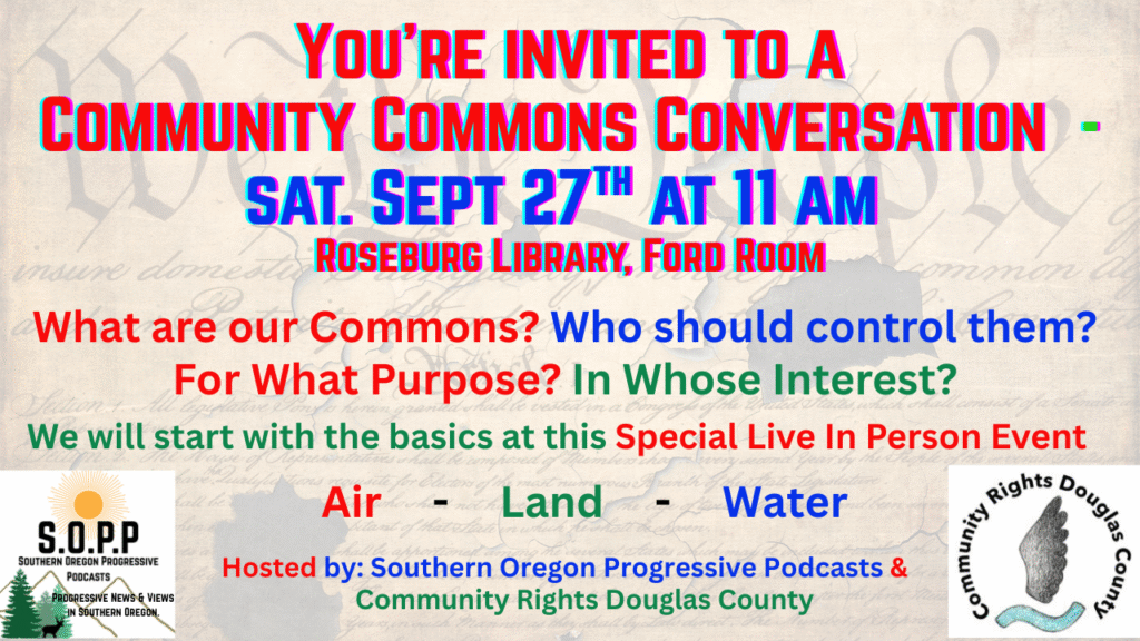 Featuring Michelle Holman and Rob Dickinson of Community Rights Lane County – Discussing the Lane County Watersheds Bill of Rights Initiative.